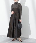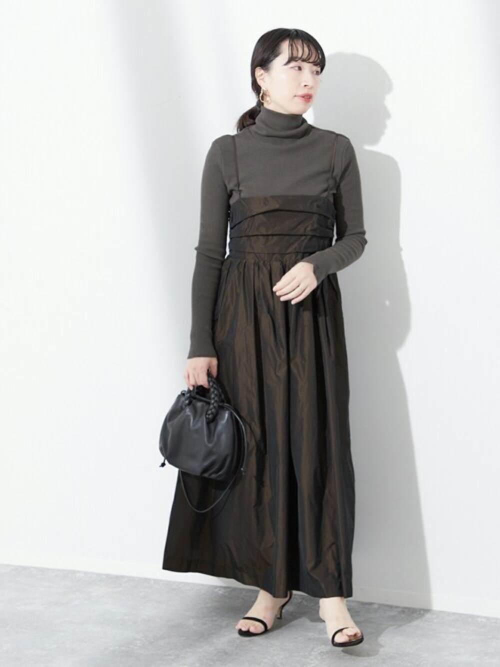 ◆メモリータフタキャミワンピース ハリ感のあるボリュームキャミワンピース。 シーズンレスで堪能できるキャミワンピースはニットと合わせたり、カットソーと合わせたりと便利なアイテム。大人っぽい控えめな光沢感と、長めの着丈で幼くならないのがポイント。 ブーツでも、サンダルでもしっくりくるので、手持ちのアイテムのプラスワンにぴったりです。 ********************** 透け感:なし 裏地:あり 伸縮性:なし 光沢感:ややあり 生地の厚さ:普通 ********************** 【スタッフ着用コメント】 《スタッフ O》 年齢:40代前半/身長:157cm/着用サイズ:FREE サイズ感:身頃もゴム仕様でゆったりしています 素材感:ハリのあるタフタ素材 着心地:軽くて着やすいです。着丈も長めで安心感あります。 **********************