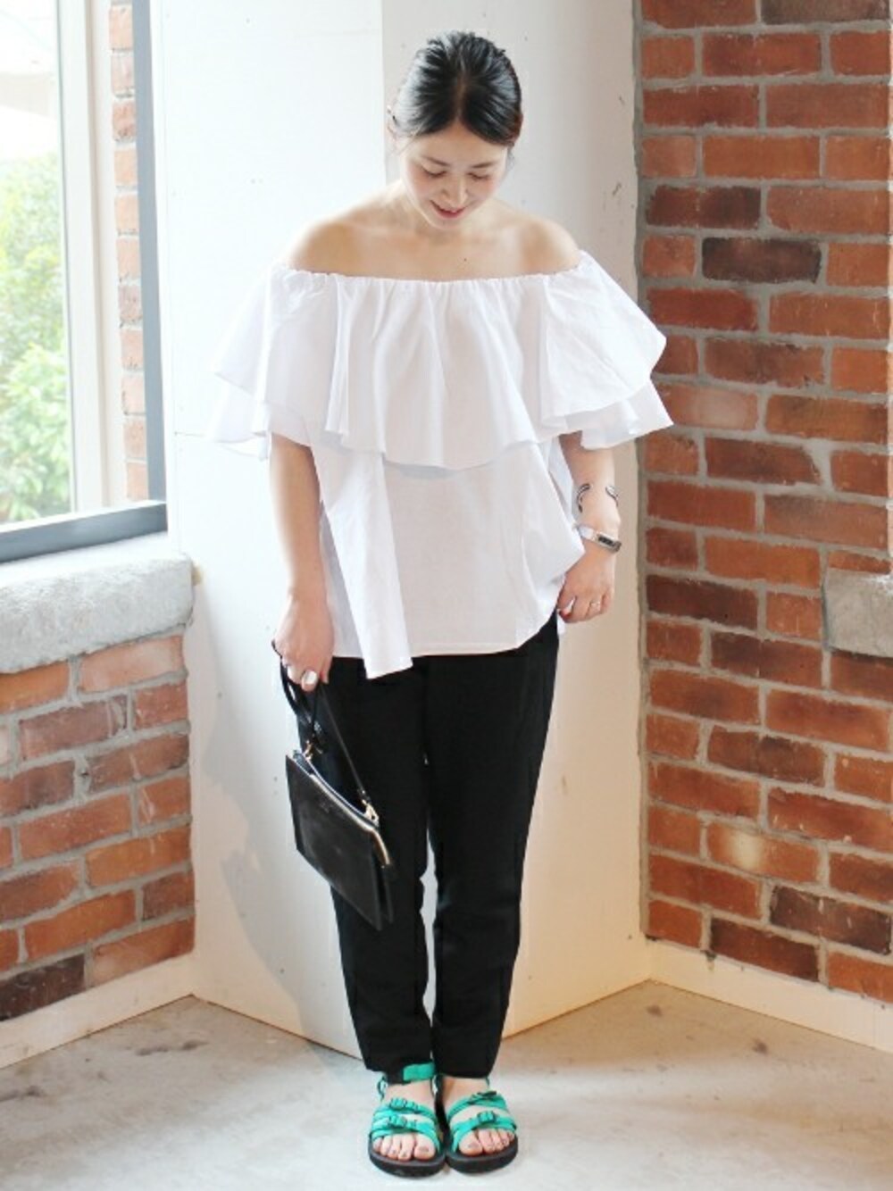 さらりとした麻混の生地のブラックのテーパードパンツに 大きめなフリルで甘さをプラス。足元はスポーティなサンダルで絶妙なバランスに。