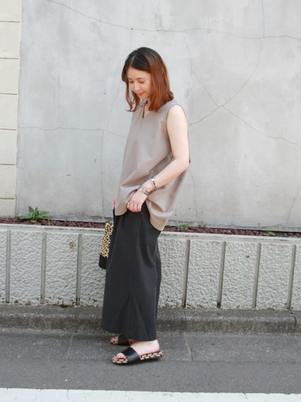 シンプルなデザインのトップスとパンツを大人なカラーでコーディネート。フラットなサンダルでヌケ感をプラスしました。