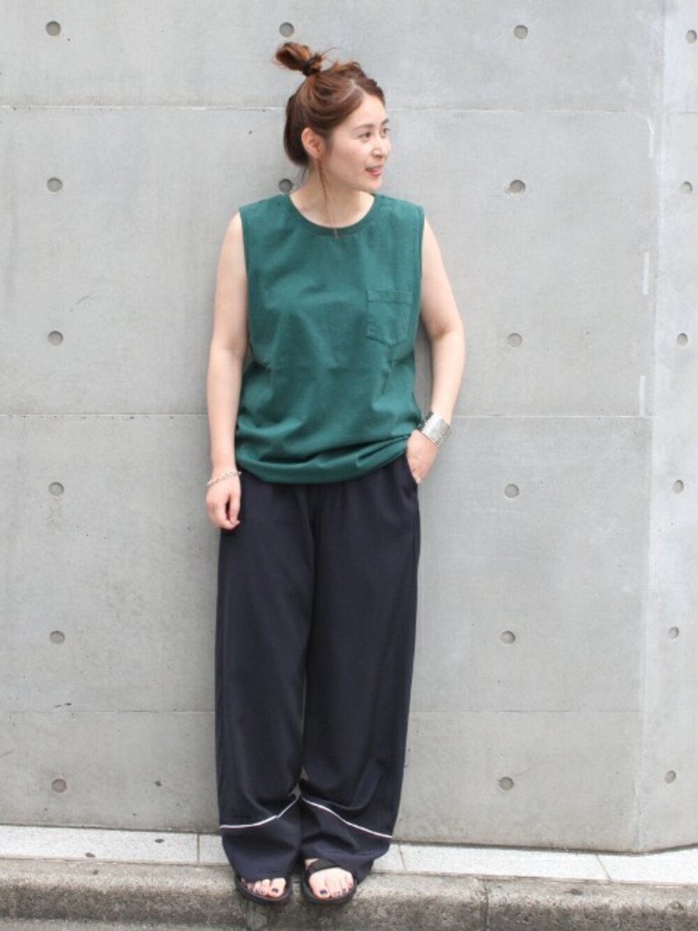 パジャマパンツでリラックス感のあるスタイル。 ネイビー×グリーンのPOPなカラー合わせで大人カジュアルに。