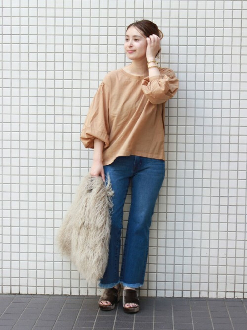 《予約》ローンジャージ パフスリーブトップス 秋らしいヌーディなキャメルカラーにパフスリーズで1枚で旬なスタイリングが叶うアイテムです! デニムxサンダルでカジュアルに。