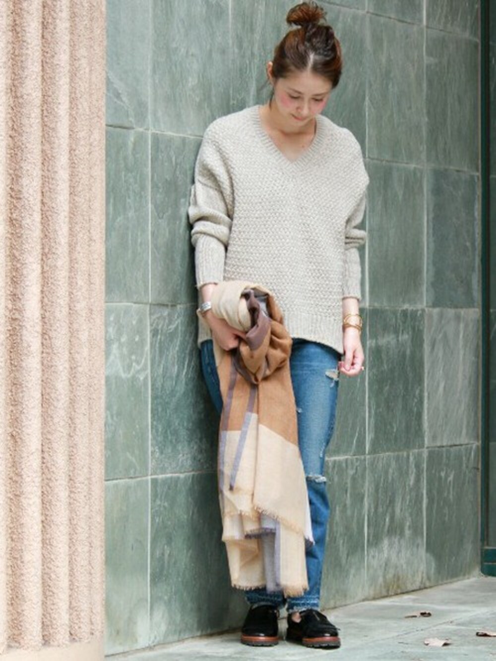 ゆったりとしたコクーンシルエットと、凹凸のある編地のニット。 デニムに合わせることで、ホールガーメント製法で仕上げた立体的なシルエットを惹きたてます! 肌寒くなってきたので、ストールがアクセントに。
