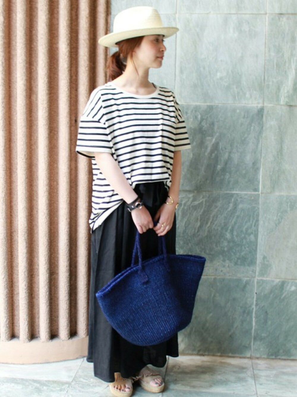 夏らしい雰囲気のボーダーカットソー。 ほどよくゆったりとしたサイジングで抜け感をプラスしてくれます。 麻のマキシスカートと合わせて清涼感のあるスタイル。