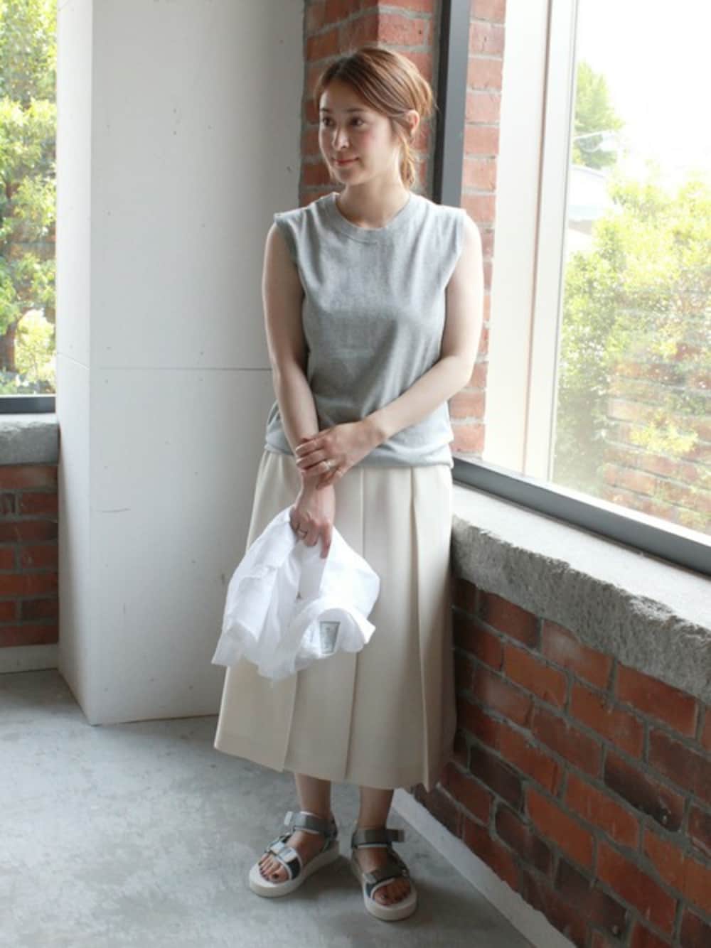 カジュアルライクなグレーのノースリーブカットソーは大人っぽい雰囲気の白のプリーツスカートで。 全体をグレーとホワイトでまとめた大人カジュアルスタイルです。