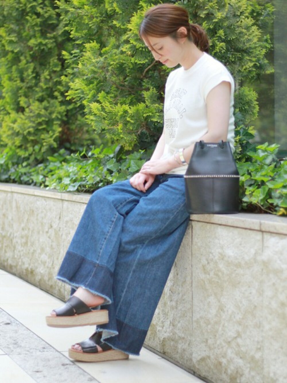 人気のRITA JEANSの別注Tシャツ。 白は定番アイテムのDENIMと合わせて。 今年は厚底のサンダルと合わせるのがオススメです! BAGはJ&M DAVIDSONで少しカジュアルアップ。