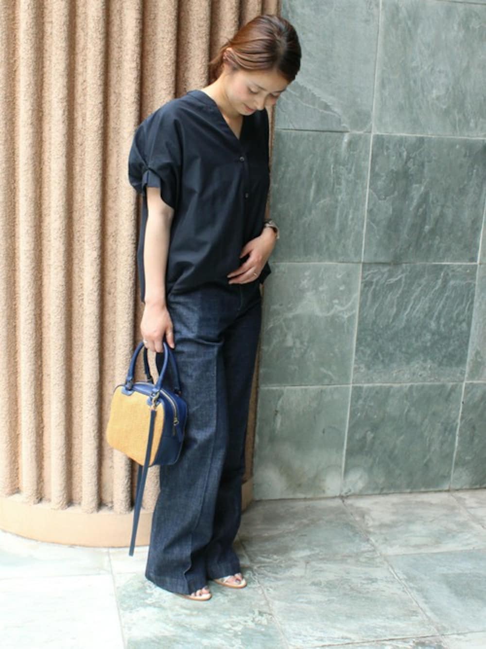 【2016 SS】 JOURNAL STANDARD L'ESSAGE 袖のタックがトレンド感のあるタックスリーブブラウス。 落ち着いたネイビーベースのコーディネートで商品にまとめました。