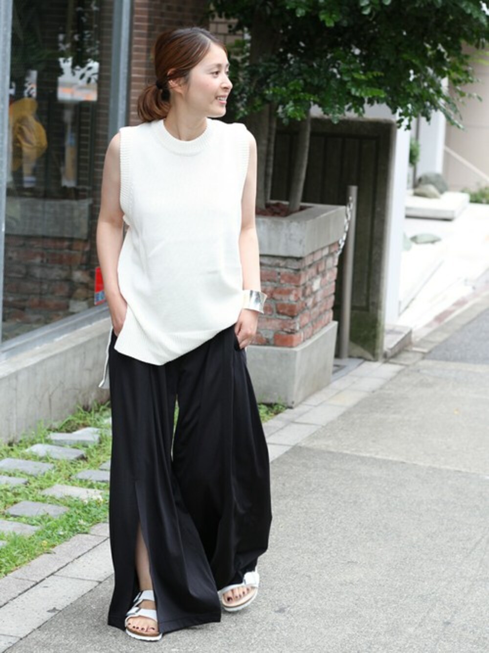 夏のモノトーンコーデ! 今年トレンドの“スリット”がポイントのカットソーパンツ。 ブラックだと、カットソーでもカジュアル過ぎずに着こなせるので便利なアイテムです。 アクセもシルバーをチョイスしてシンプルに!