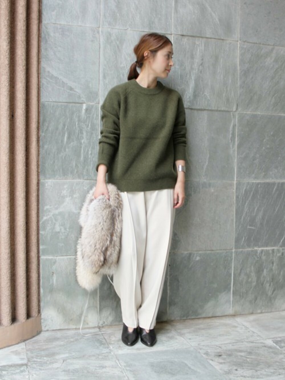 ベーシックな畦ニット! どんなスタイリングにもマッチするベーシックな畦ニット。 落ち着きのあるカーキが大人に仕上がる一枚。 ファー小物を合わせてトレンド感をプラス。