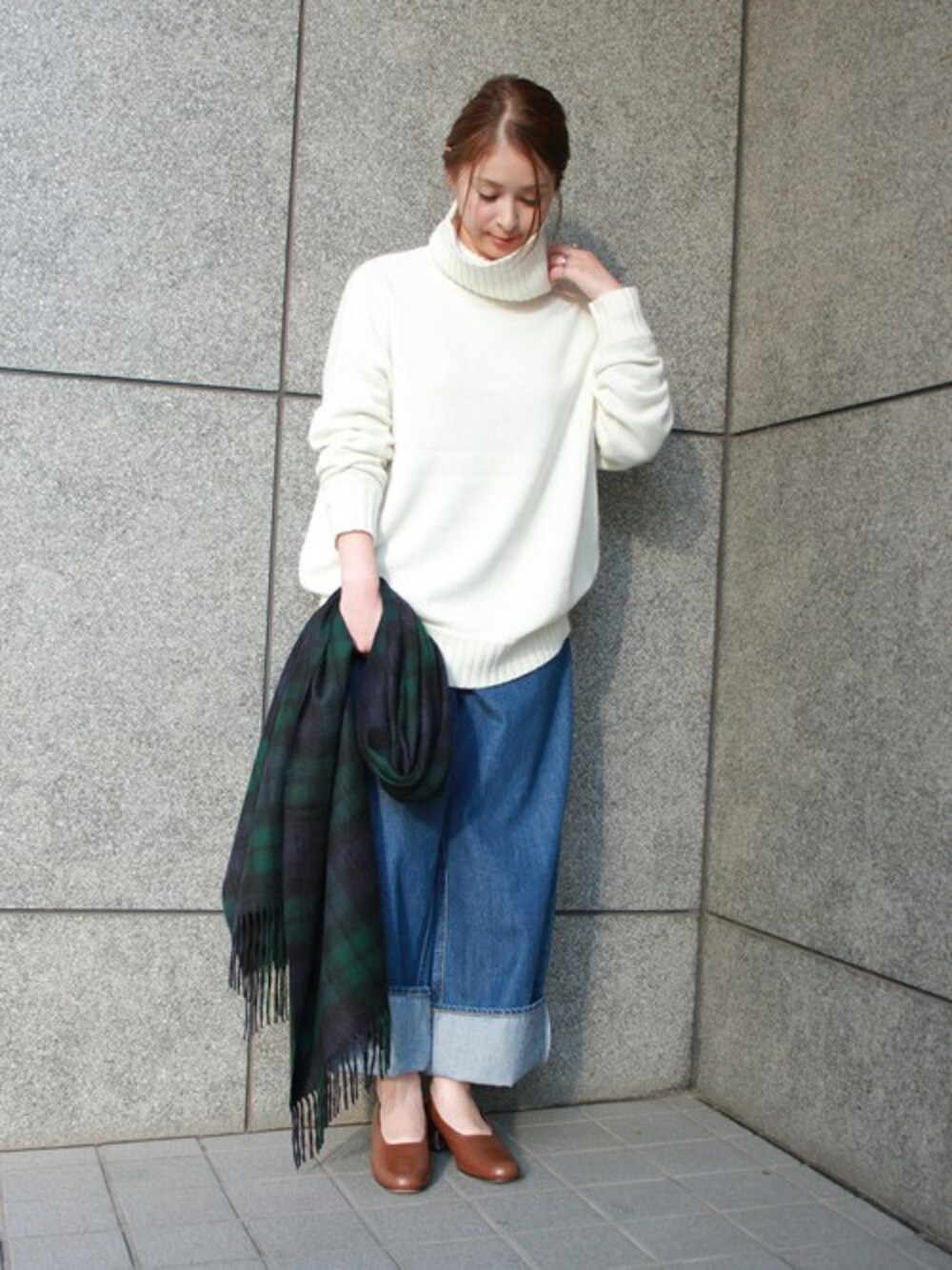 柔らかな素材が着心地のよいタートルネックニット! 程よいルーズなシルエットが抜け感をプラスしてくれているタートルニット。 ワイドに折り返したデニムが旬な印象に。