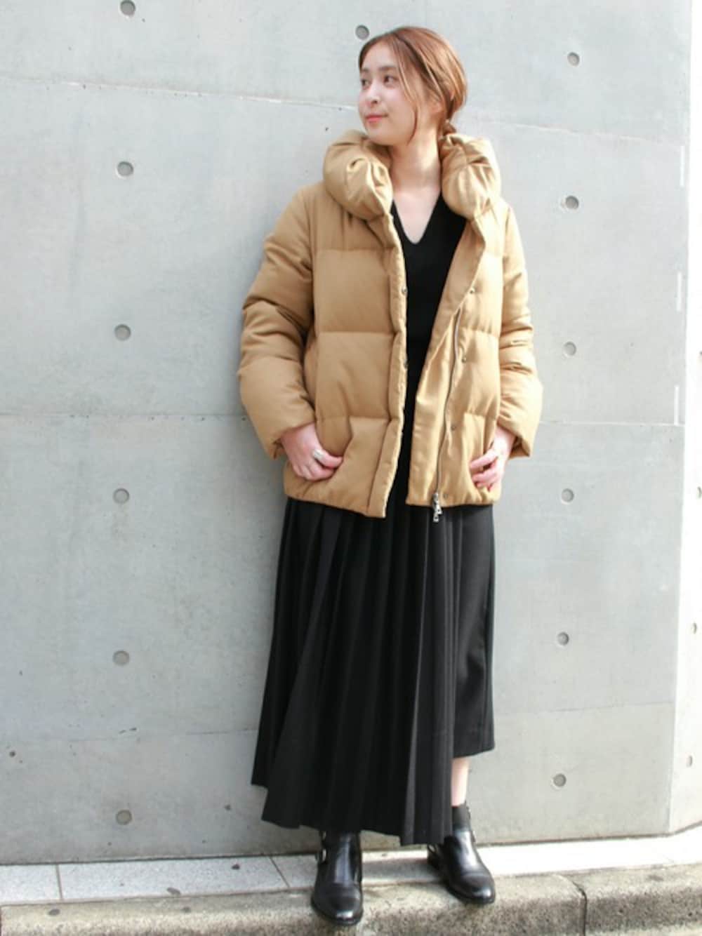 女性らしいカラーのダウンコート! 柔らかい雰囲気の出るベージュのコートにブラックのスカートを合わせたコーディネート。太めのプリーツがアクセントになっています。