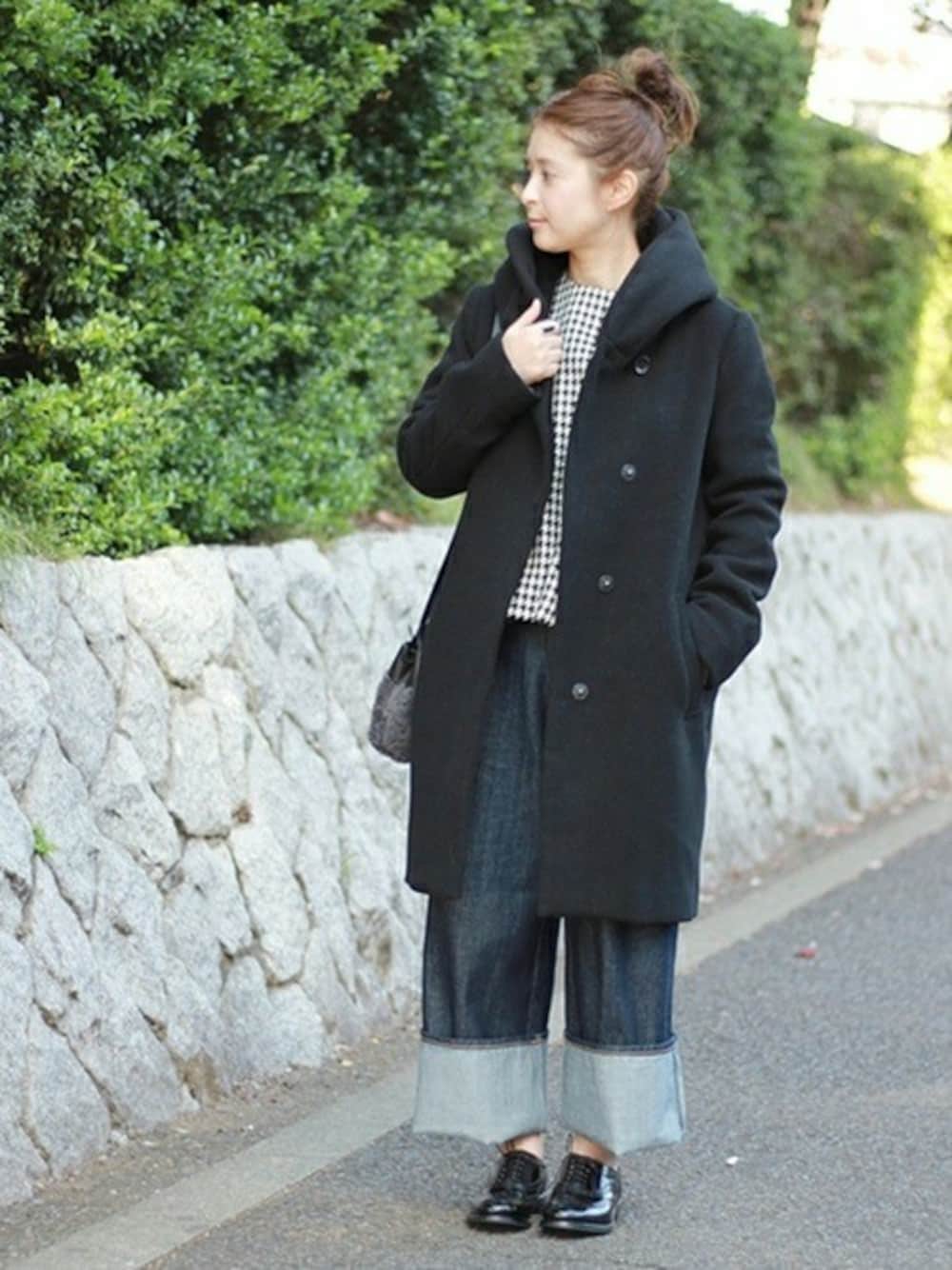 シンプルで使いやすい丈感のコートとデニムを合わせてカジュアルにしたスタイル。インナーに柄物を入れてアクセントプラスしました!