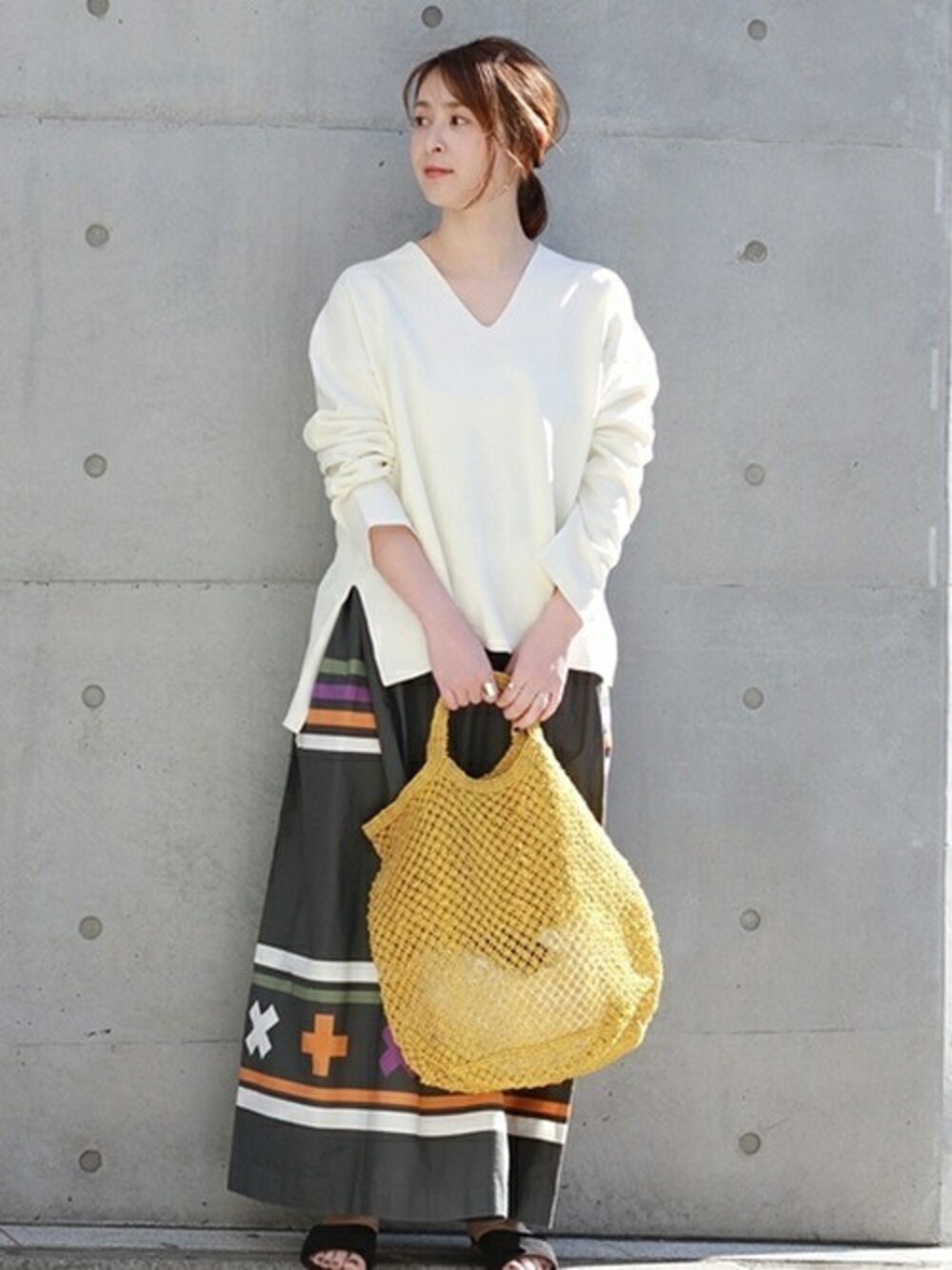 シンプルなニットに存在感のあるスカートを合わせた春らしいスタイリング!イエローのバックでぐっと鮮やかに!