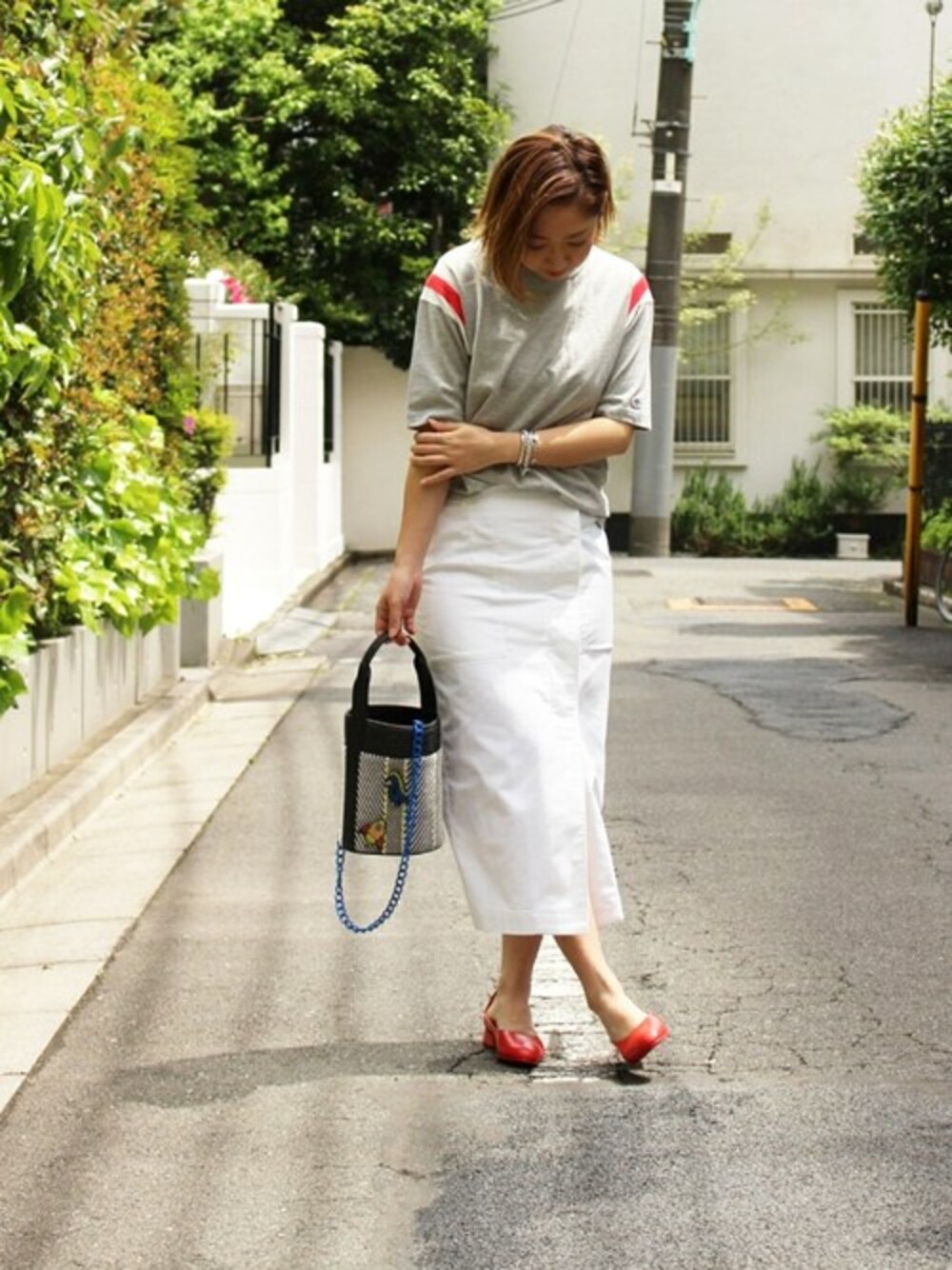 ◆カジュアルTシャツxスカートコーデ Tシャツのラインとシューズを朱赤で揃えたスタイリングは、メンズライクになり過ぎないようタイトスカートを合わせて大人のカジュアルスタイルに!!