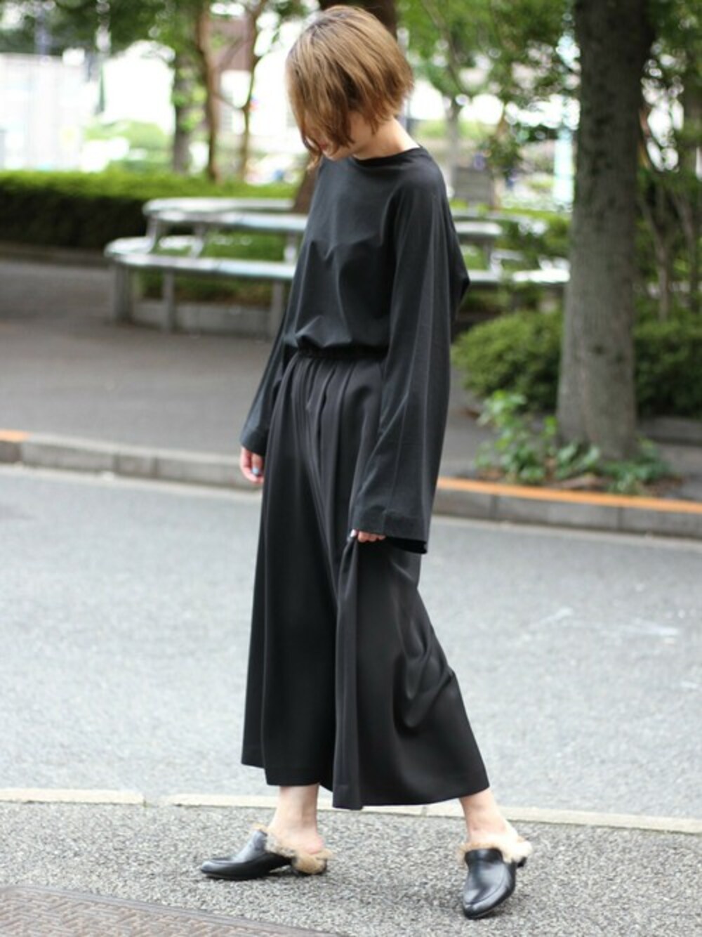 ブラックでまとめた大人なコーデ。 フレアスリーブのトップスとワイドパンツが今年らしいバランスに仕上がります。