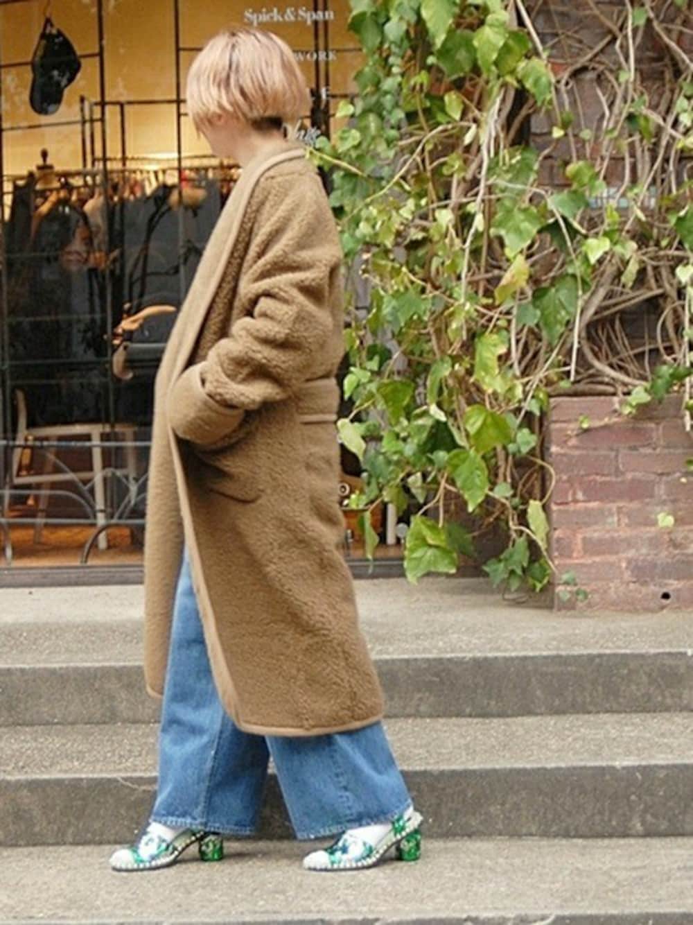 ガウンのようにバサッと羽織れる気軽さもありながら、少し肉厚なボアの素材が暖かく冬らしい。少し肩をぬいて、袖を思いっきりロールアップして着るとバランスが取りやすいです。
