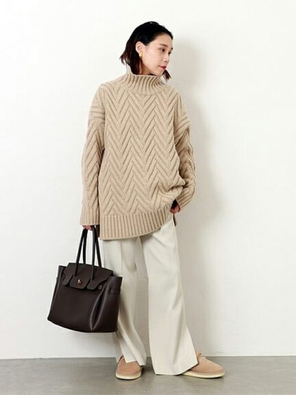 ヘリンボン柄の高級感のある編地が魅力のニット。 タートルネックに高さがあり、衿をしっかりと立てられるのも今年らしい着こなしが叶うポイントです。
