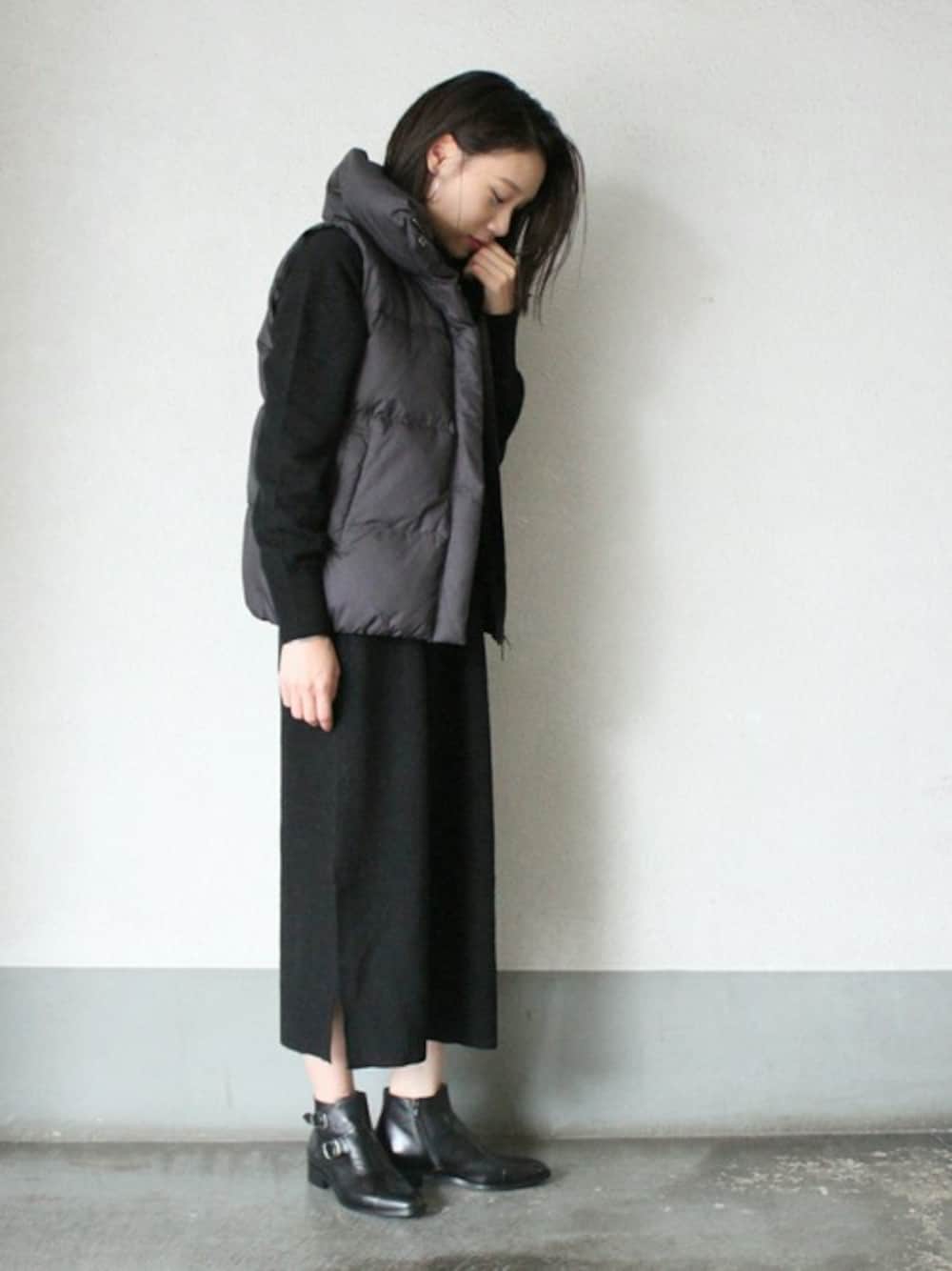 サイドスリットがアクセントになったニットワンピース。 カシミヤ混のやわらかな素材が着心地の良いシリーズです。 カジュアルなダウンベストも落ち着きのあるブラックなら大人な印象に。