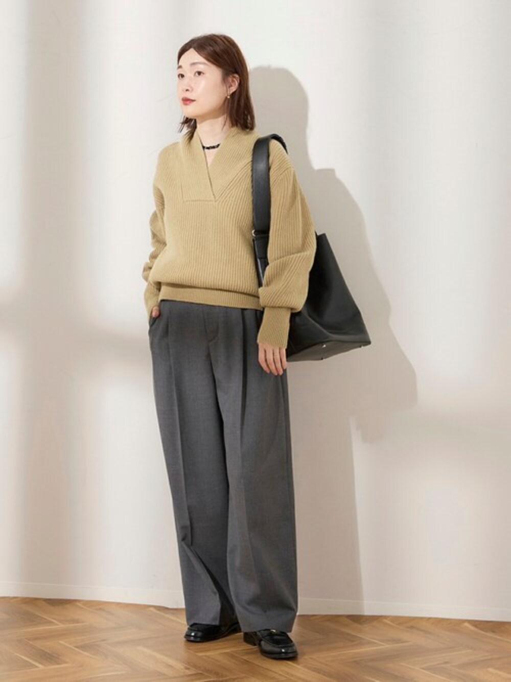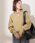 ◆デザインVネックトップス しっかりとした重量感があり、フォルムの出るウール素材を使用したニット。 少し長めのボディはボトムを選ばす合わせられ、レイヤードもしやすい襟ぐりに仕上げました。 メンズライクながら襟ぐりを抜いて女性らしくも着用でき◎ 長めな袖でたっぷりするボリューム感もポイントで、一枚で様になるアイテムです。 ********************** 透け感:なし 裏地:なし 伸縮性:ややあり 光沢感:なし 生地の厚さ:やや厚手 ********************** 【スタッフ着用コメント】 《スタッフK》 年齢:20代後半/身長:162cm/着用サイズ:FREE サイズ感:全体的にゆったりサイズで、袖も長めです。 素材感:毛100%で暖かいです。 着心地:しっかりとした編地で冬に活躍するニットです。 **********************