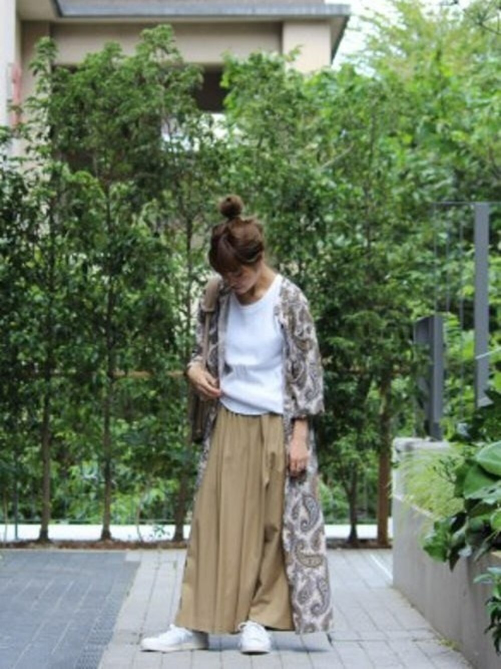 ◆ペイズリーガウン 同系色の入ったペイスリーワンピースを羽織ったスタイルは今の時期にぴったり! 落ち着いたベージュのバックを合わせて大人カジュアルスタイルに。