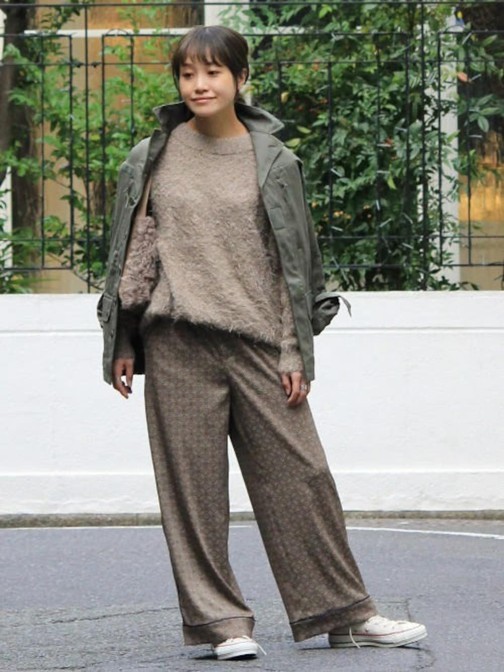 肌なじみよいベージュカラーはワントーンコーデで。 カーキのミリタリージャケットを軽く羽織って、カジュアルさをプラス。