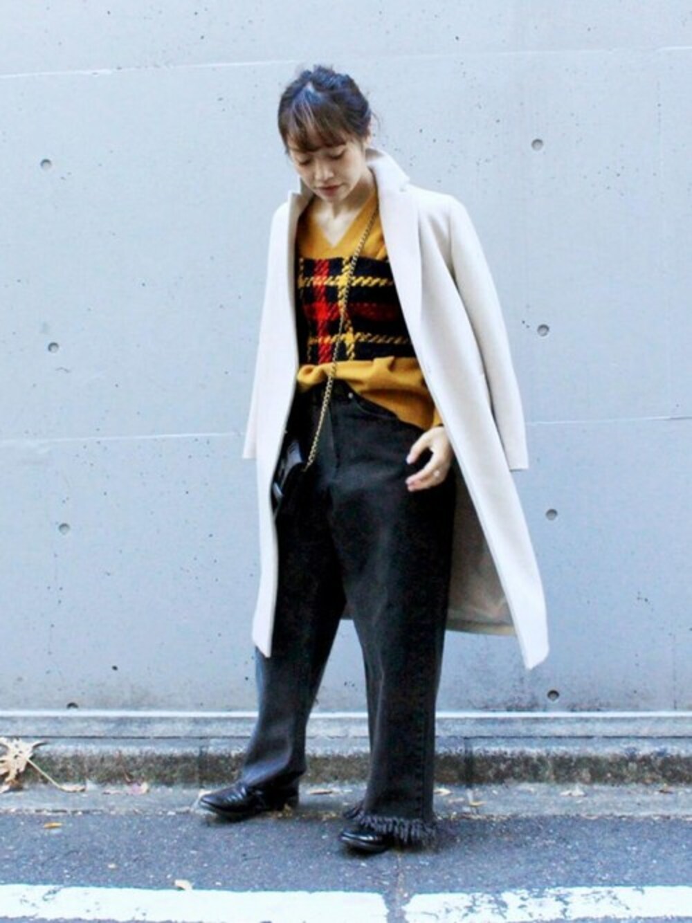 ◆チェック柄ビスチェ シンプルなVネックのニットに、今注目のチェック柄ビスチェをレイヤードすることで一気に洒落感がUP!