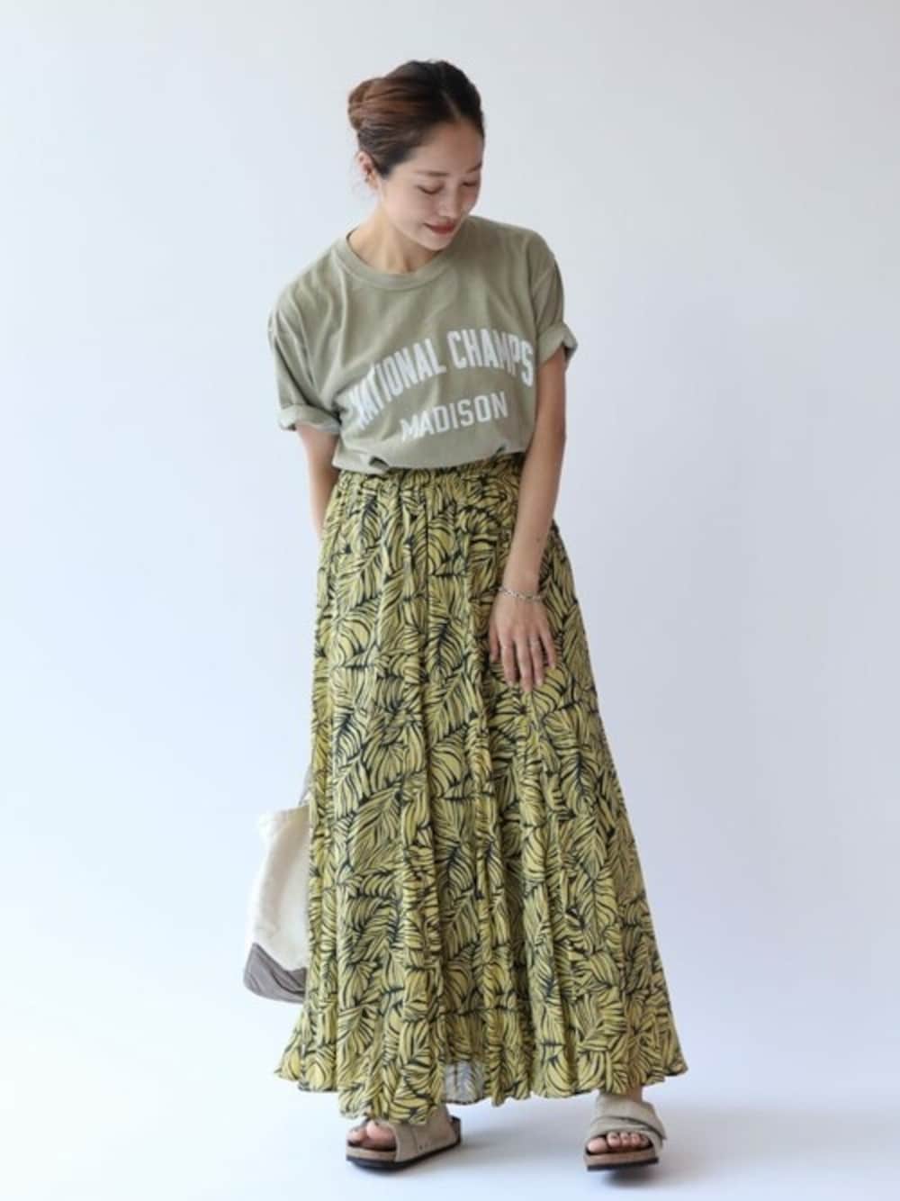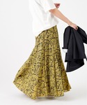 ■オリエンタルプリントスカート JOURNAL STANDARDオリジナルプリントが最大の魅力のスカート! 夏らしいリーフプリントの柄でブラック×イエローの配色が目を惹く一枚です。 シルエットは細かいギャザーがふんだんに入っていながら、ボリュームがですぎず綺麗なマ ーメイドスカートのようなデザインに。 夏はTシャツに合わせるだけでコーディネートが完成する優秀さ。 今回はイエローのプリントアイテムにはなじみの良いベージュを合わせて柔らかな印象にまとめてみました! サイズ感:着丈が長めで157センチで38サイズを着用。くるぶしが隠れる長さです。 素材感:やわらかい手触り。レーヨンが入っているのでしなやかさがあります。 着心地:裏地付きで気楽に一枚で着用できるのがうれしい。ウエストゴムで楽ちんにきていただけます。