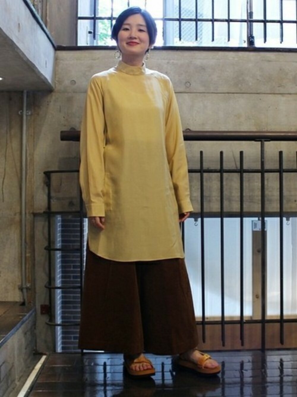 ◆おすすめワントーンコーデ ベージュ、イエロー、ブラウンのカラーをまとめたワントーンコーデ。ボリュームアイテムにスポーツサンダルを合わせて抜け感を。