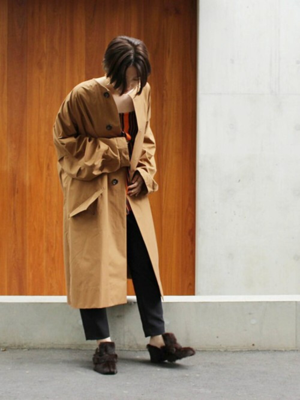 ◆STUDIO NICHOLSONコート カラーリングとタックのデザインが素敵なストライプのキャミブラウスとテーパードパンツに、オーバーサイズのコートで外したスタイル。 足元は KMBのファーサンダルでグッと秋を感じる装いに!