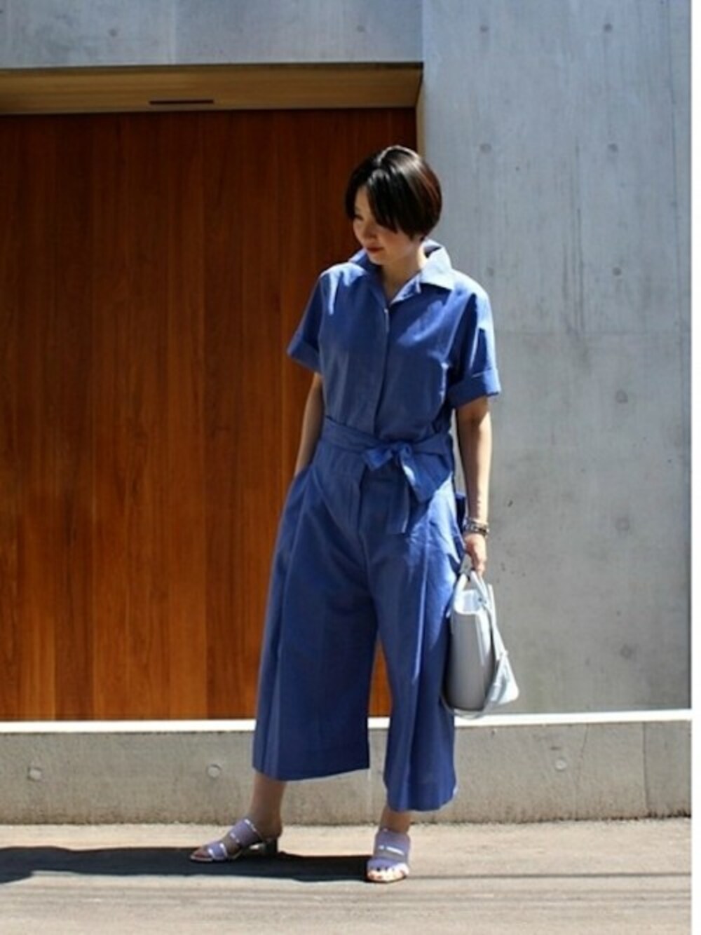 ◆オールインワンにミュールを合わせたシンプルなコーディネート 春夏シーズンに意外とスタイリングの一役かってくれる肌なじみのよい シルバーのミュールをチョイス。