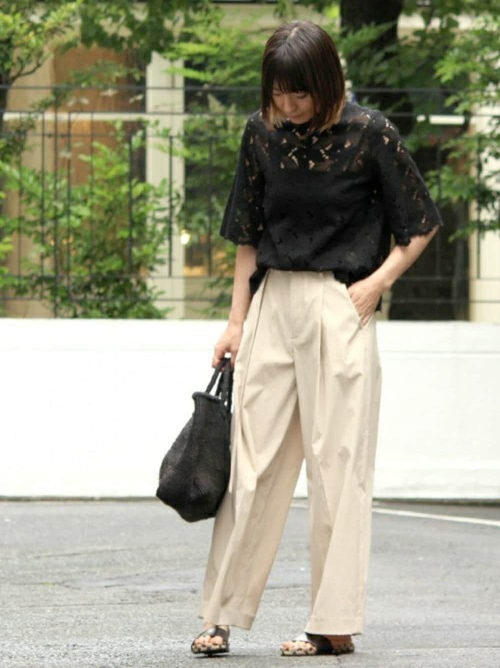◆夏の素肌に気持ちいいワイドパンツ クリーンなベージュのパンツには、黒のレースブラウスを合わせてシックな大人スタイルに。 同素材の長めのベルトなど、トレンドもしっかり押さえた今年一押しのパンツです。