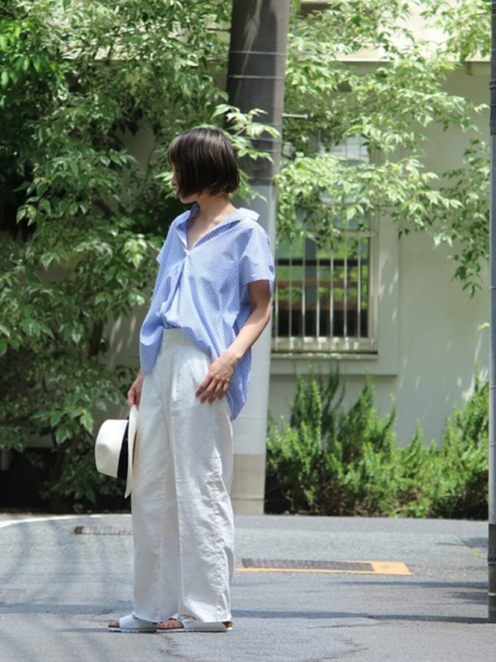 横からのフォルムが素敵なシャツメインに、WHITE×BLUEの爽やかなスタイル!! シャツは、肩を抜いて抜け感を出すのがおすすめ。 麻のパンツでカジュアルに。