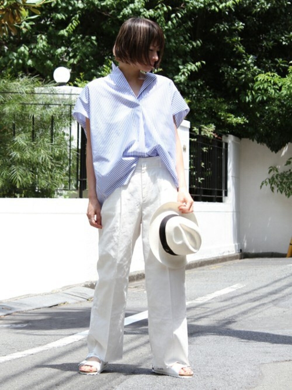 ◆WHITE&BLUE RESORT! 横からのフォルムが素敵なシャツメインに、WHITE×BLUEの爽やかなスタイル!! シャツは、肩を抜いて抜け感を出すのがおすすめ。 麻のパンツでカジュアルに。