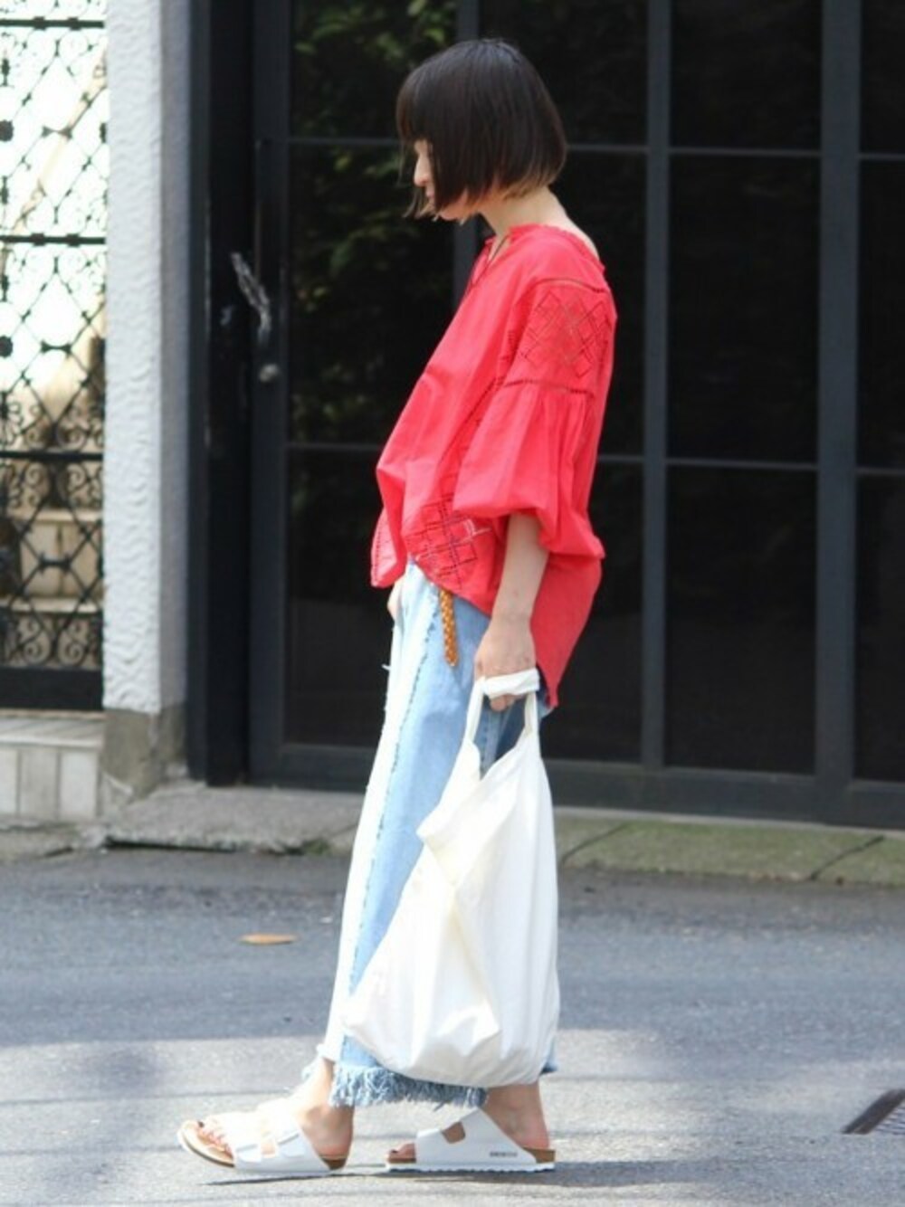 夏の日差しに負けない鮮やかなアカは、顔移りを華やかに見せてくれます。 小物はパキッとした白で統一することで、より初夏らしいスタイルに。