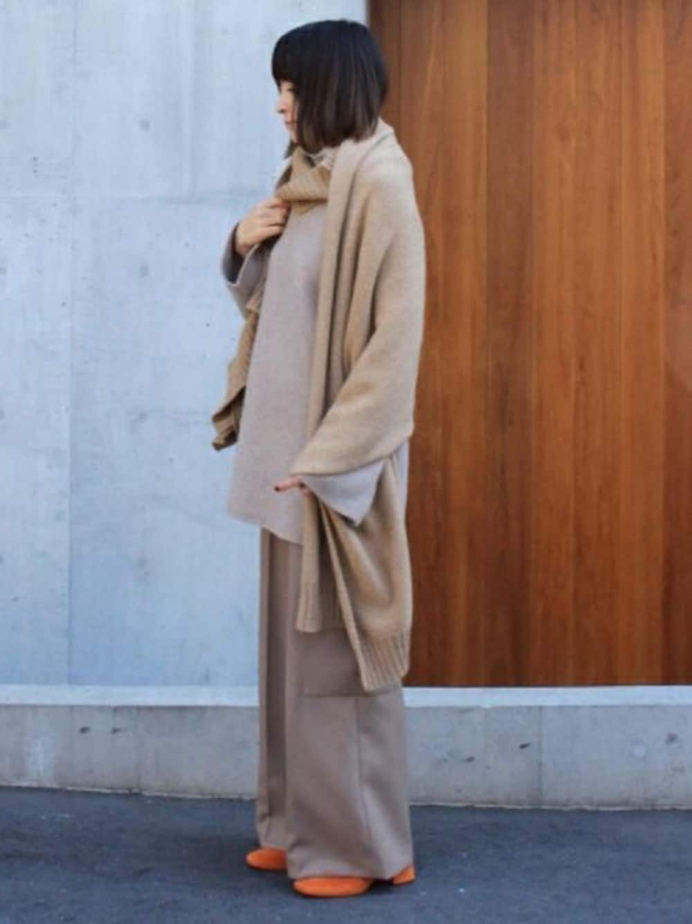 ◆上質な素材のニットにニットのストールをレイヤードしたスタイル。グラデーションで仕上げたスタイルに“ORANGE”のシューズがよく映えます。