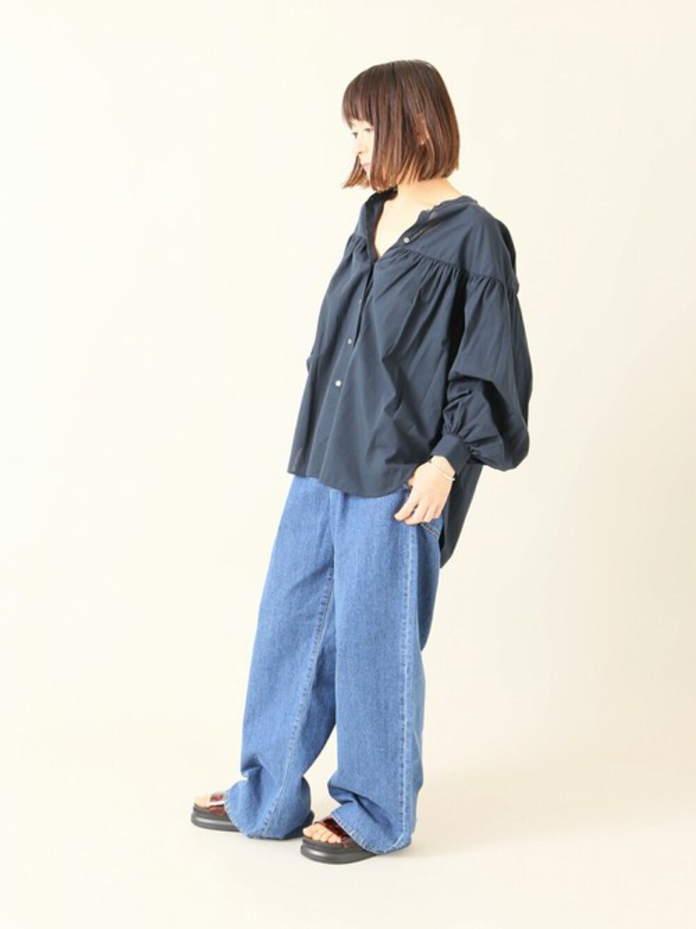 ふんわりとかろやかなギャザーブラウス。ストライプとムジでご用意し、デニムやさまざまなアイテムと着用いただけます。