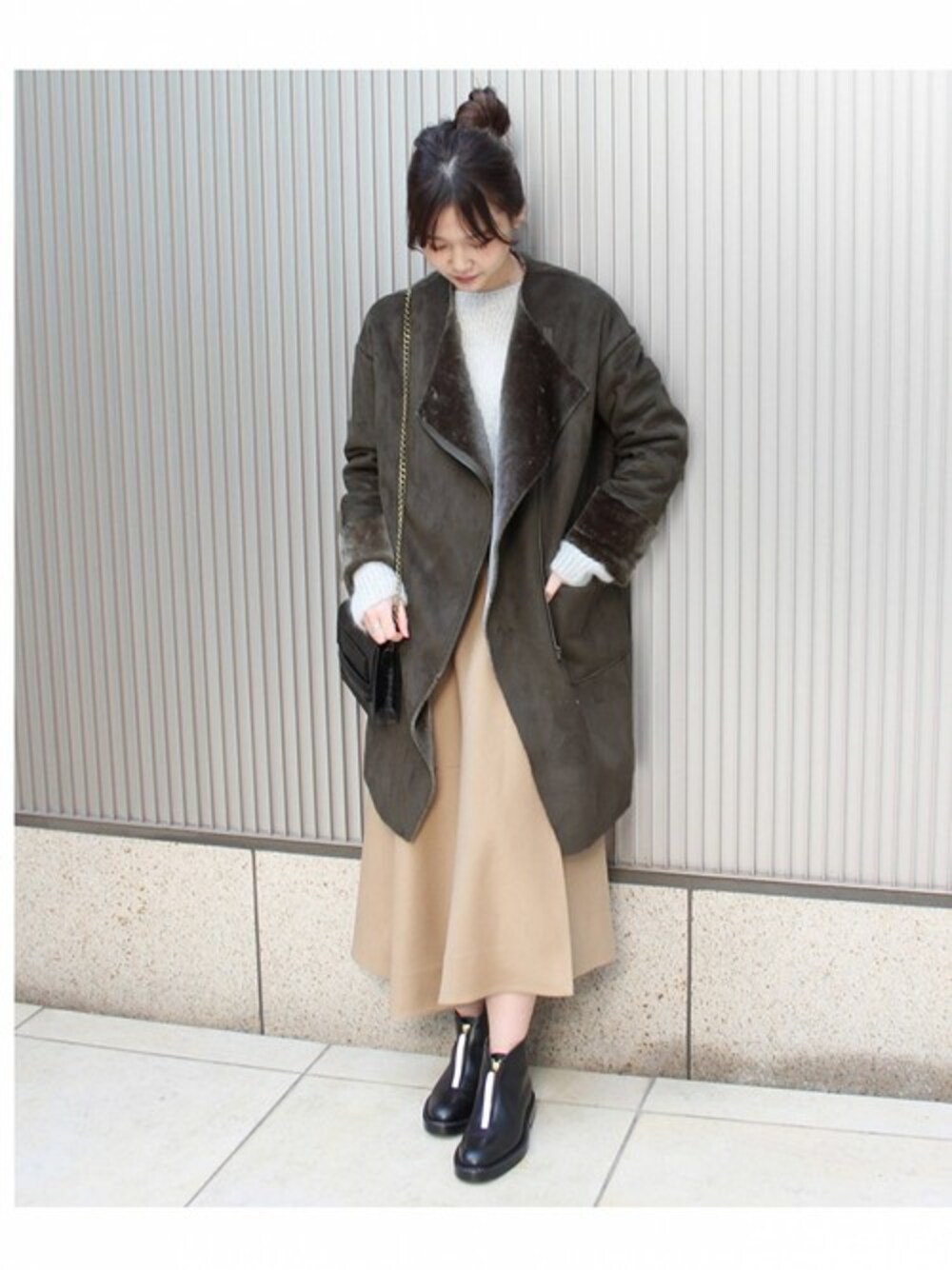 大人気のフェイクムートンコートが再入荷。 軽くて肌触りが良く着心地抜群です。 スカートとも相性良くすっきり着て頂ける着丈です。