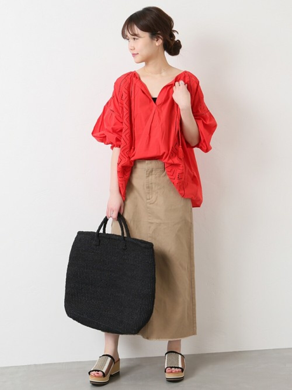 今シーズンも欠かせない!エンブロイダリーブラウスが登場!襟元は肩を抜いてラフに合わせて頂くことで女性らしい抜け感を演出。