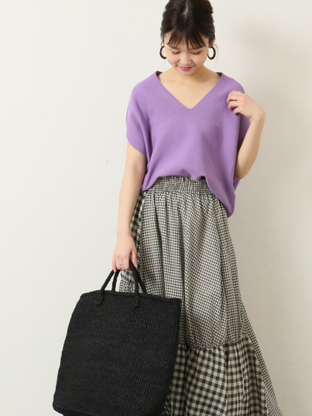 さらっとした肌触りの素材を使用し、ホールガーメントで立体的に編み上げたニットプルオーバー。モノトーンにパープルをアクセントにしたオトナな着こなし。