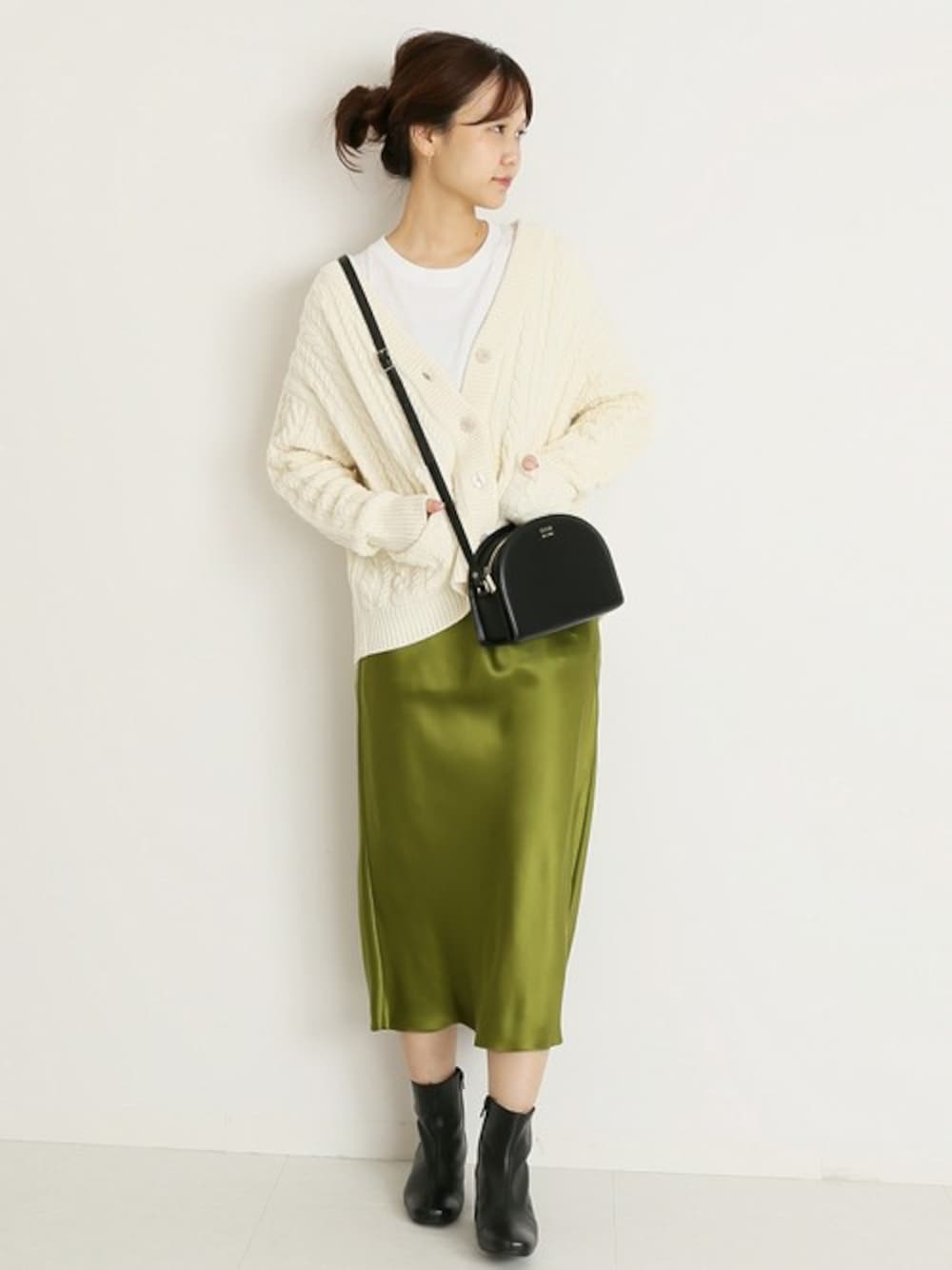 適度な肉感とドロップショルダーが一枚で様になるカーディガン。トレンドのサテンスカートとあわせて旬な着こなしに。