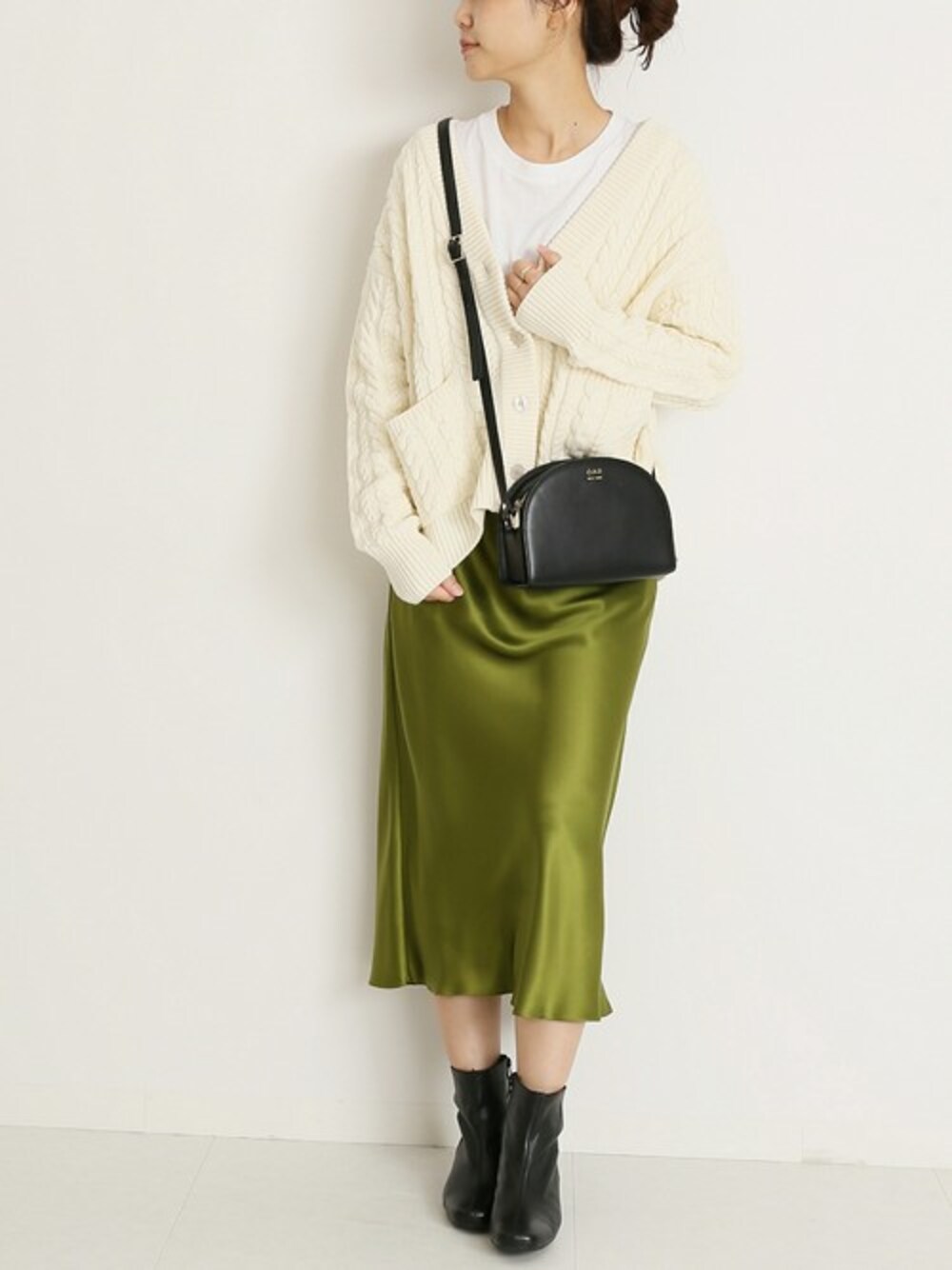適度な肉感とドロップショルダーが一枚で様になるカーディガン。トレンドのサテンスカートとあわせて旬な着こなしに。