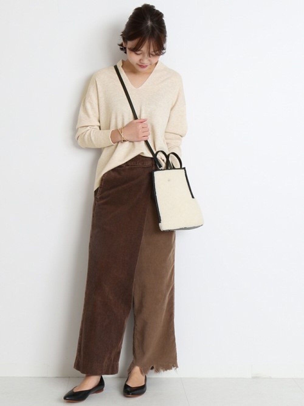 自然な抜き衿になるデザインで、立体感がでるVネックニット。 コーデュロイパンツを合わせてカジュアルに。