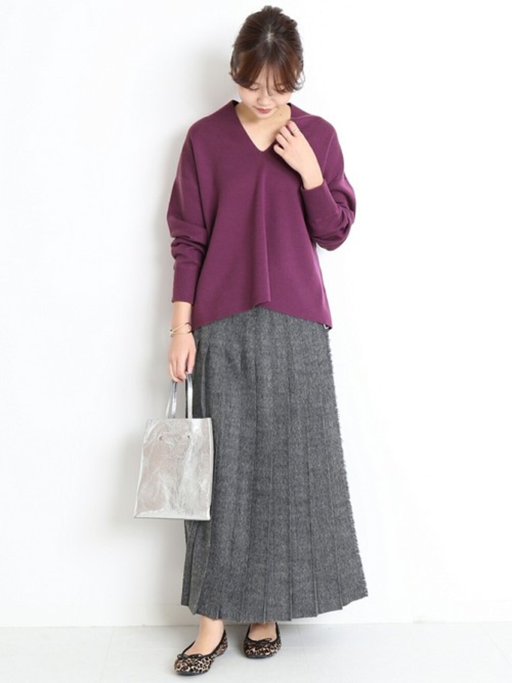 シンプルながらも1枚で様になるアイテムです。 トレンドカラーのパープルはマキシスカートと合わせて大人っぽく。
