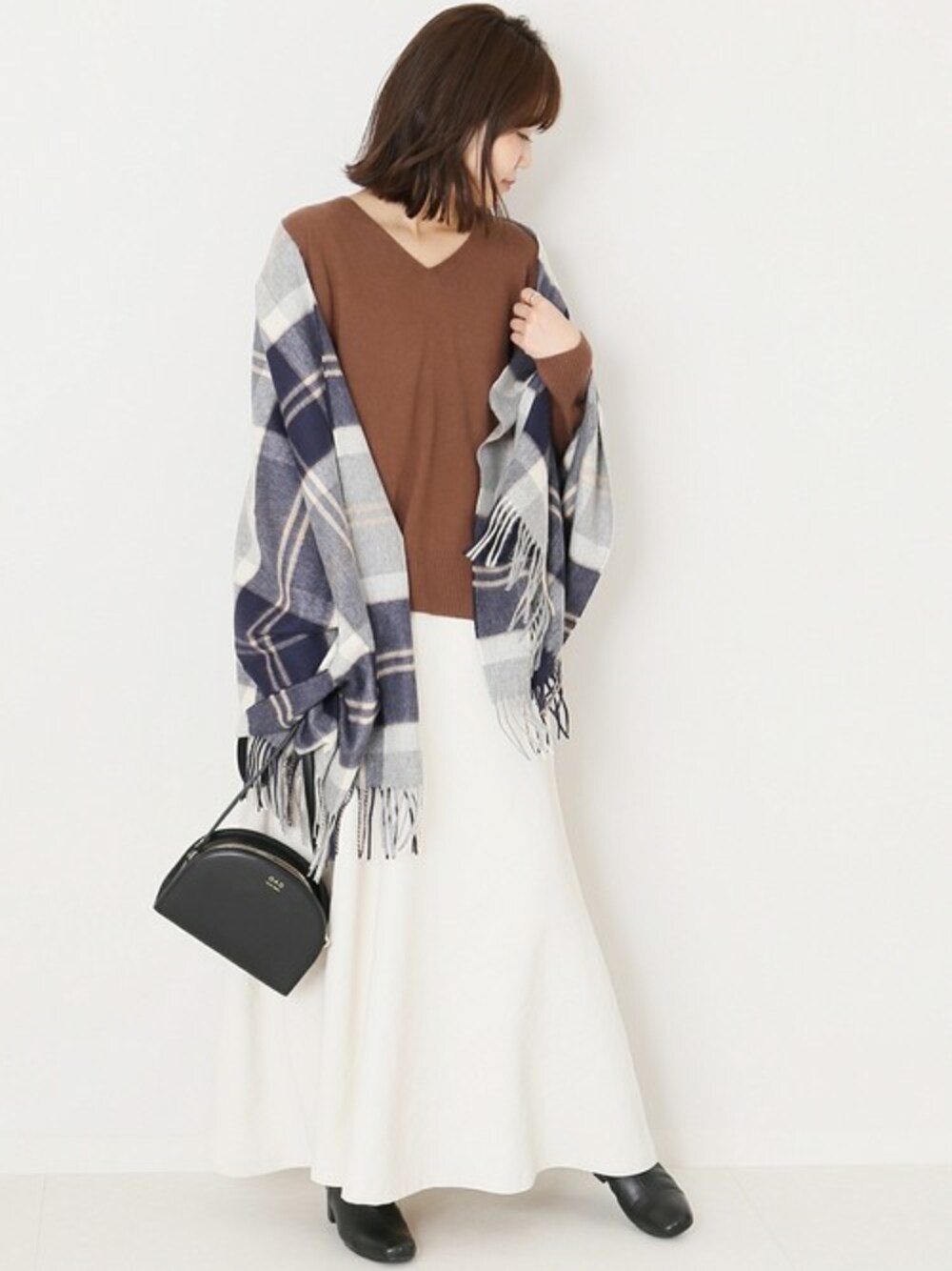 ネック周りはシンプルなデザインにし、Vネックが鎖骨ラインを綺麗に女性らしく見せてくれるニット。チェックストールをポイントに。