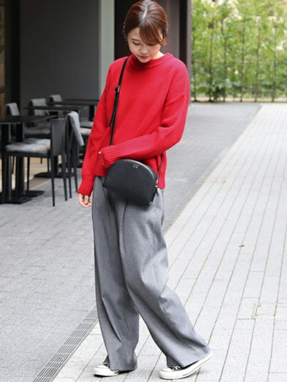 レディライクな赤のニットにはメンズライクなボトムを合わせて。