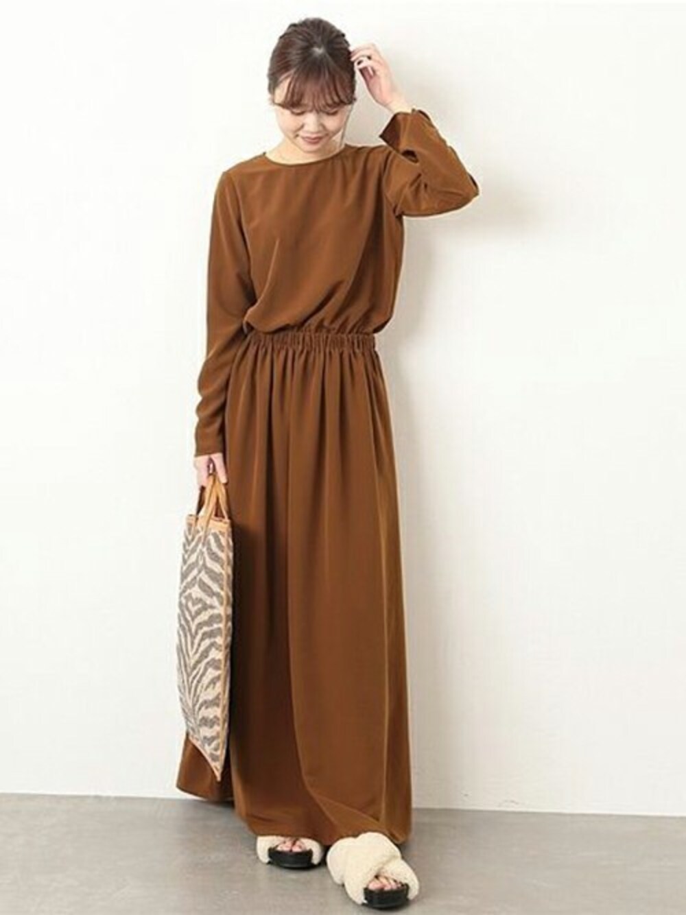 大人の女性が一枚で着たくなるマキシ丈ワンピース。 光沢感のある素材感が大人っぽく落ち着いた雰囲気で着て頂けます。 ウエストがゴムになっていることで、1枚で楽にさらっと着られるデザイン。