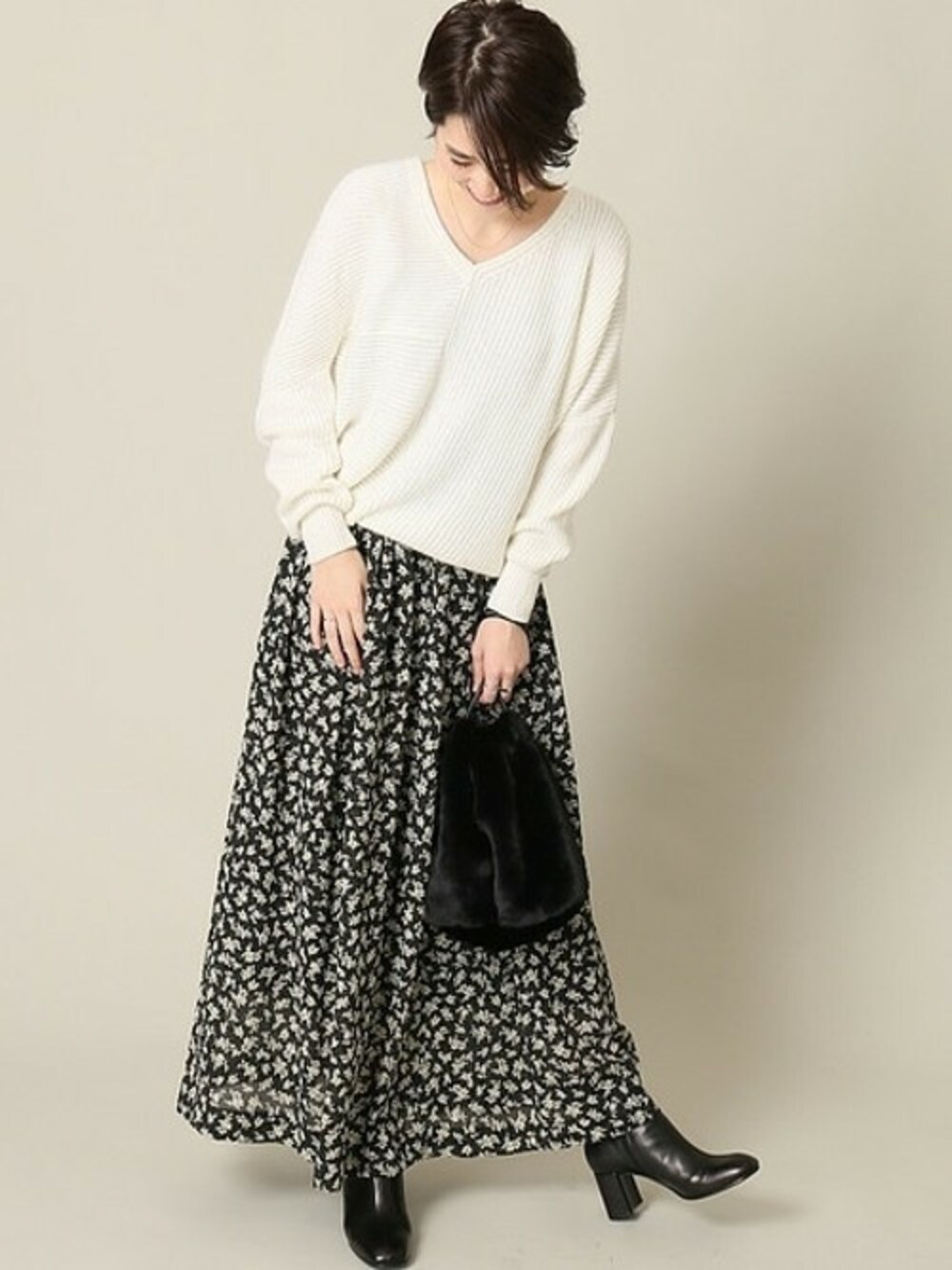 ◆JS+eフラワードットタックスカート 程よい光沢感と軽やかさが着こなしを華やかにみせてくれるスカート。 ブーツやスニーカーなど足元のアイテムを選ばすに合わせられるロング丈。