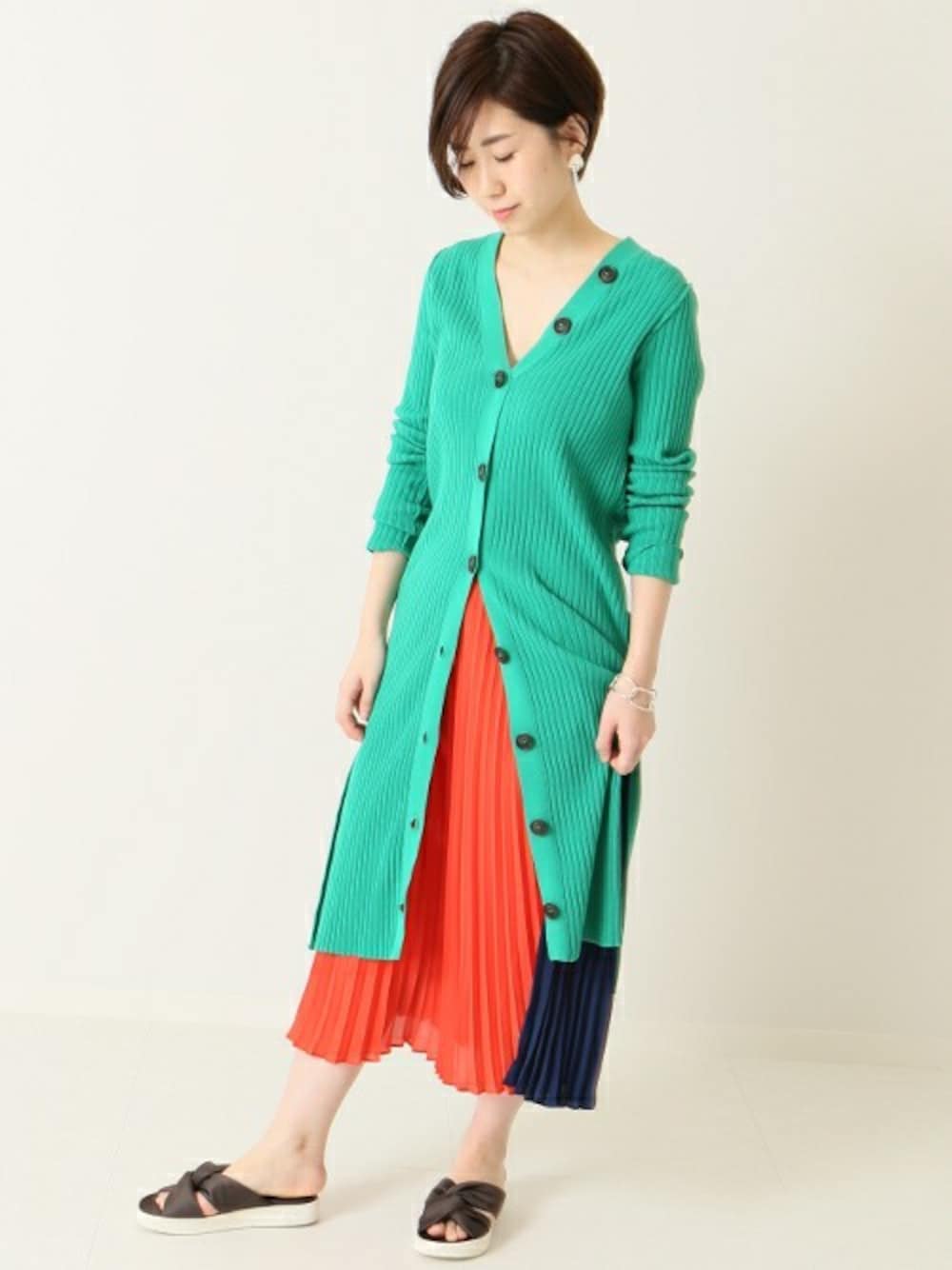 ◆カラーブロッキングがポイントのプリーツスカート トレンドのプリーツスカートをカラーブロッキングで仕上げ他にはないアイテムに。 スッキリとした落ち感があり、すっきりと魅せてくれるのも嬉しいポイント。
