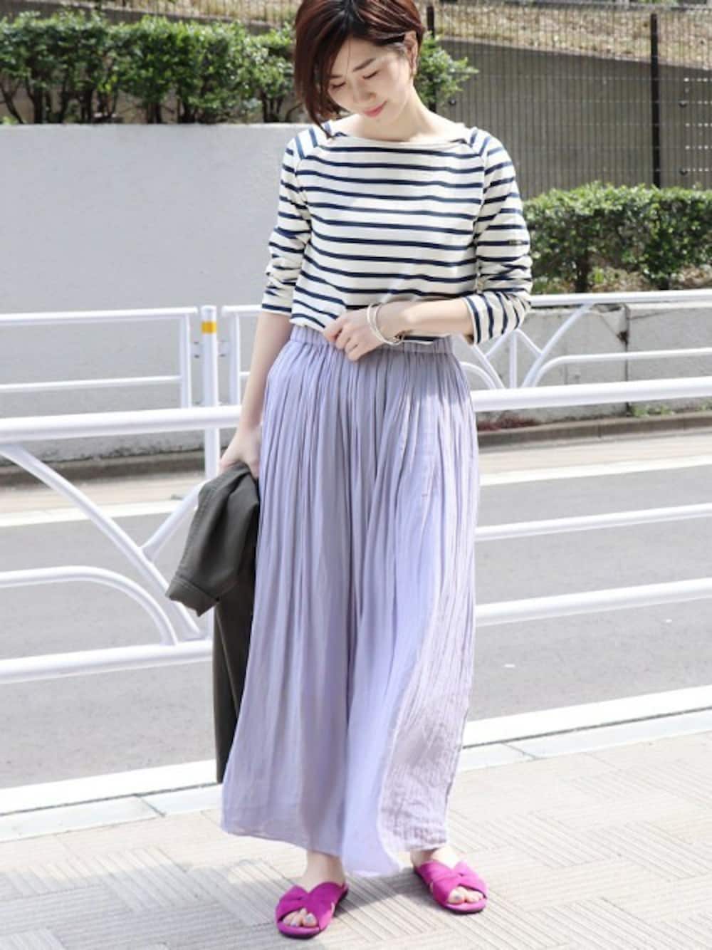 人気のカラースカートは柔らかいパープルが今年の気分! ボーダーと合わせてカジュアルな着こなしに。