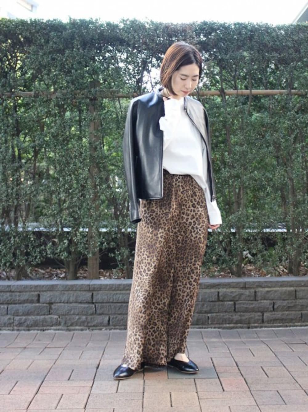 アウターとシューズをレザーでまとめて統一感を。 インパクトがあるレオパードパンツもSWEAT SHIRTSを合わせる事で派手すぎず決まります。