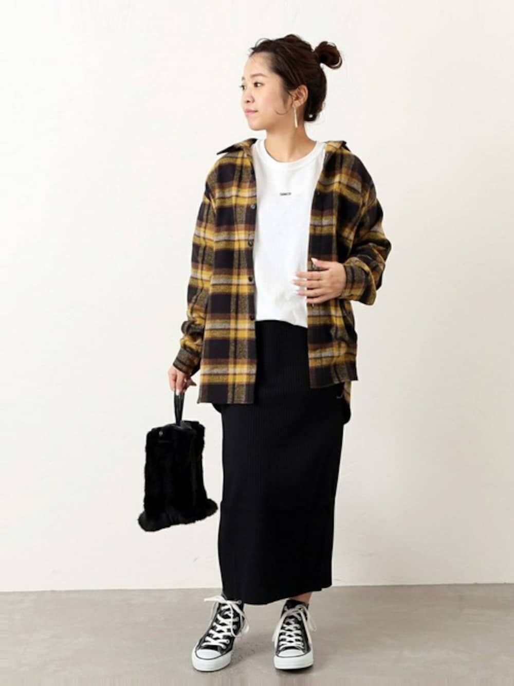 トレンドのウールチェックのシャツをカジュアルに、スカートで女性らしく◎